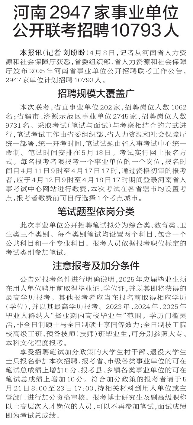 4月8日,记者从河南省人力资源和社会保障厅获悉,省委组织部、省人力资源和社会保障厅发布2025年河南省事业单位公开招聘联考工作公告,2947家单位计划招聘10793人。(今日《郑州日报》2版)