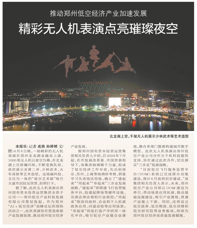 4月8日晚,一场精彩的无人机表演在郑州北龙湖金融岛上演。1000架无人机以夜空为幕,在北龙湖上空斑斓闪烁,不断变换队形,依次展示炎黄二帝、少林武术、火车高铁等艺术造型。这场融科技、文化为一体的“星空艺术展”吸引大量市民驻足欣赏,拍照打卡。(今日《郑州日报》2版)