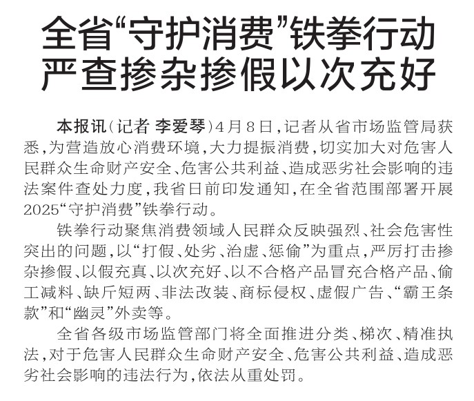 4月8日,记者从省市场监管局获悉,为营造放心消费环境,大力提振消费,切实加大对危害人民群众生命财产安全、危害公共利益、造成恶劣社会影响的违法案件查处力度,我省日前印发通知,在全省范围部署开展2025“守护消费”铁拳行动。(今日《郑州日报》2版)