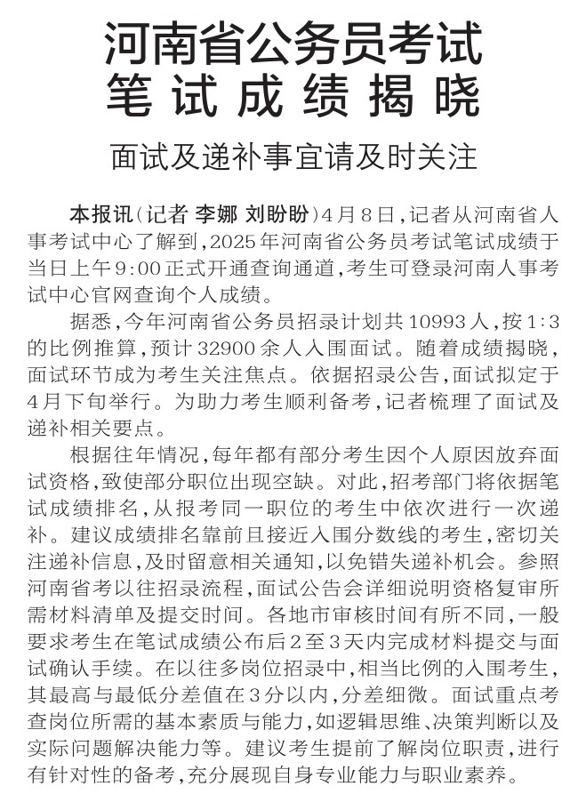 4月8日,记者从河南省人事考试中心了解到,2025年河南省公务员考试笔试成绩于当日上午9:00正式开通查询通道,考生可登录河南人事考试中心官网查询个人成绩。(今日《郑州日报》2版)