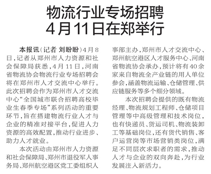 4月8日,记者从郑州市人力资源和社会保障局获悉,4月11日,河南省物流协会物流行业专场招聘会将在郑州市人才交流中心举行。此次招聘会作为郑州市人才交流中心“全国城市联合招聘高校毕业生春季专场”系列活动的重要环节,旨在搭建物流行业人才与企业的精准对接平台,促进人力资源的高效配置,推动行业进步、助力人才就业。(今日《郑州日报》2版)