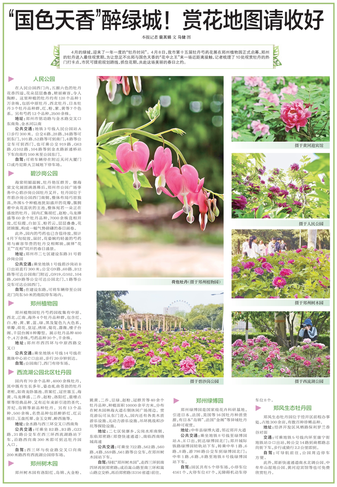 4月的绿城,迎来了一年一度的“牡丹时间”。4月8日,我市第十五届牡丹芍药花展在郑州植物园正式启幕,郑州的牡丹进入最佳观赏期,为让您足不出郑与国色天香的“花中之王”来一场近距离接触,记者梳理了10处观赏牡丹的热门打卡点,市民可提前规划路线,抓住花期,共赴这场美丽的春日之约。(今日《郑州日报》5版)