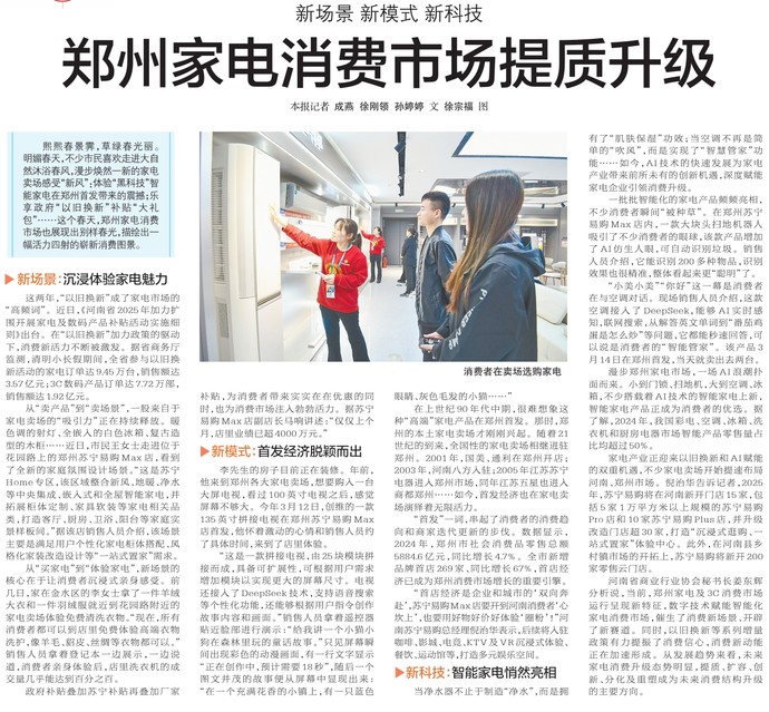 熙熙春景霁,草绿春光丽。明媚春天,不少市民喜欢走进大自然沐浴春风,漫步焕然一新的家电卖场感受“新风”:体验“黑科技”智能家电在郑州首发带来的震撼;乐享政府“以旧换新”补贴“大礼包”……这个春天,郑州家电消费市场也展现出别样春光,描绘出一幅活力四射的崭新消费图景。(今日《郑州日报》6版)
