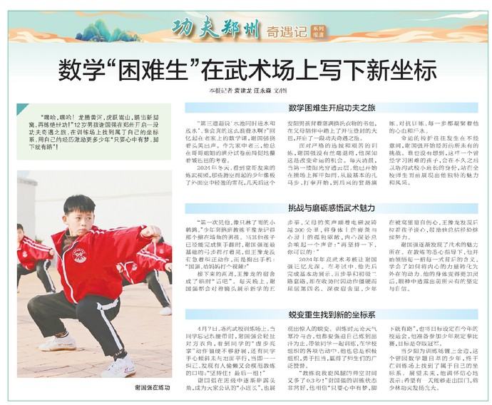 “嘿哈,嘿哈!龙腾黄河,虎跃嵩山,踏出新脚窝,再练绝世功!”12岁男孩谢国强在郑州开启一段功夫奇遇之旅,在训练场上找到属于自己的坐标系,用自己的经历激励更多少年“只要心中有梦,脚下就有路”!(今日《郑州日报》8版)