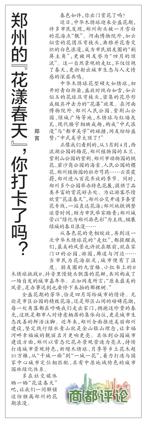 近日,中华木绣球迎来全盛花期,许多市民发现,郑州街头被一片雪白的花海点“靓”。河南博物院外,如云似雪的花团压弯枝头,典雅并花香交织的白色浪漫,成为市民朋友圈的“刷屏主角”,更被网友誉为“四月的顶流”。这一自然景观的走红,不仅惊艳了春天,更折射出城市生态与人文情感的深层共鸣。(今日《郑州日报》1版)