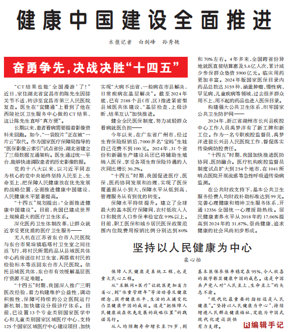 从“互联网+医疗”让就医更加省力省心,到“体重管理年”等活动普及健康理念、提升健康水平,生活的点滴变化凸显健康中国的成效。这是“把保障人民健康放在优先发展的战略位置”的践诺笃行。(今日《人民日报》1版)