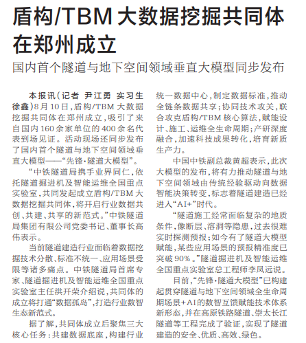 8月10日,盾构/TBM大数据挖掘共同体在郑州成立,吸引了来自国内160余家单位的400余名代表到场见证。活动现场还同步发布了国内首个隧道与地下空间领域垂直大模型——“先锋·隧道大模型”。(今日《河南日报》1版)
