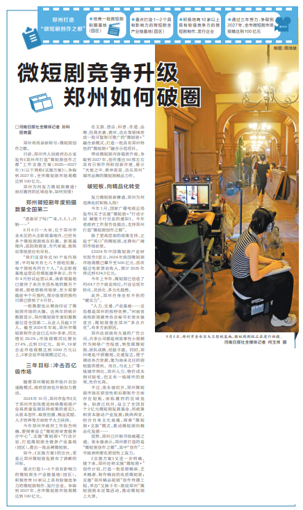 日前,郑州市人民政府办公室发布《郑州市打造“微短剧创作之都”工作实施方案(2025—2027年)》,争取到2027年,全市微短剧市场规模达到100亿元。(今日《河南日报》4版)
