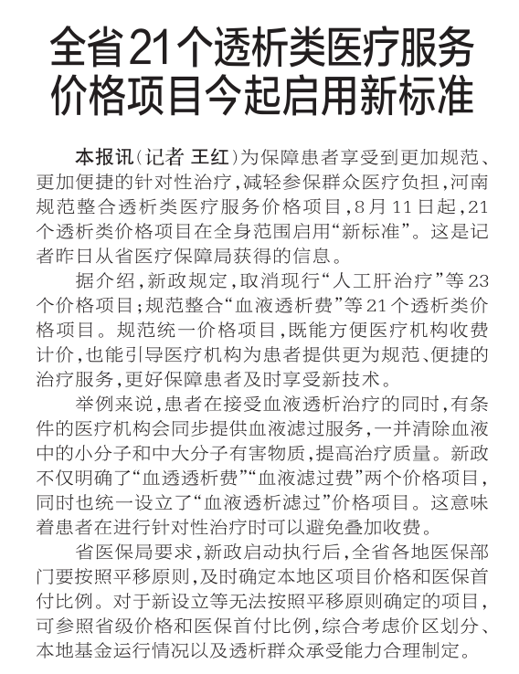 为保障患者享受到更加规范、更加便捷的针对性治疗,减轻参保群众医疗负担,河南规范整合透析类医疗服务价格项目,8月11日起,21个透析类价格项目在全身范围启用“新标准”。这是记者昨日从省医疗保障局获得的信息。(今日《郑州日报》1版)