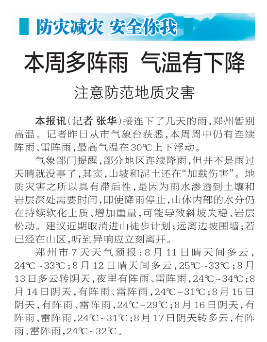 接连下了几天的雨,郑州暂别高温。记者昨日从市气象台获悉,本周周中仍有连续阵雨、雷阵雨,最高气温在30℃上下浮动。(今日《郑州日报》1版)
