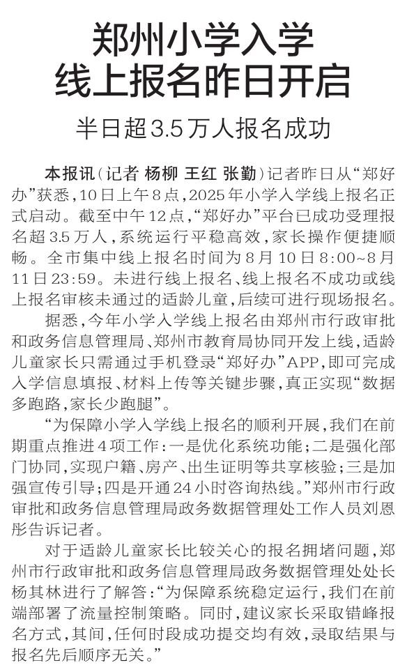 记者昨日从“郑好办”获悉,10日上午8点,2025年小学入学线上报名正式启动。截至中午12点,“郑好办”平台已成功受理报名超3.5万人,系统运行平稳高效,家长操作便捷顺畅。全市集中线上报名时间为8月10日8:00~8月11日23:59。未进行线上报名、线上报名不成功或线上报名审核未通过的适龄儿童,后续可进行现场报名。(今日《郑州日报》2版)