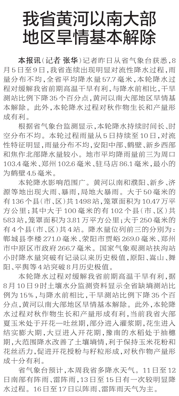 记者昨日从省气象台获悉,8月5日至9日,我省连续出现明显对流性降水过程,雨量分布不均,全省平均降水量57.7毫米,本轮降水过程对缓解我省前期高温干旱有利,与降水前相比,干旱测站比例下降35个百分点,黄河以南大部地区旱情基本解除。此外,本轮降水过程对秋作物生长和产量形成有利。(今日《郑州日报》2版)