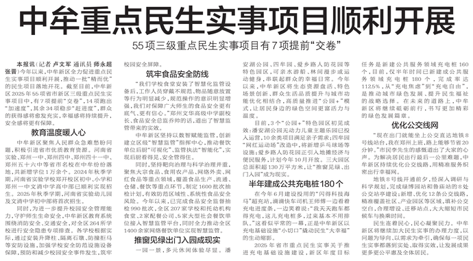 今年以来,中牟新区全力促进重点民生实事项目顺利开展,推动一批“精而优”的民生项目落地开花。截至目前,中牟新区2025年55项省市新区三级重点民生实事项目中,有7项提前“交卷”,14项跑出“加速度”,其余34项稳步“赶进度”,群众的获得感将愈发充实,幸福感将持续提升,安全感将更有保障。(今日《郑州日报》5版)