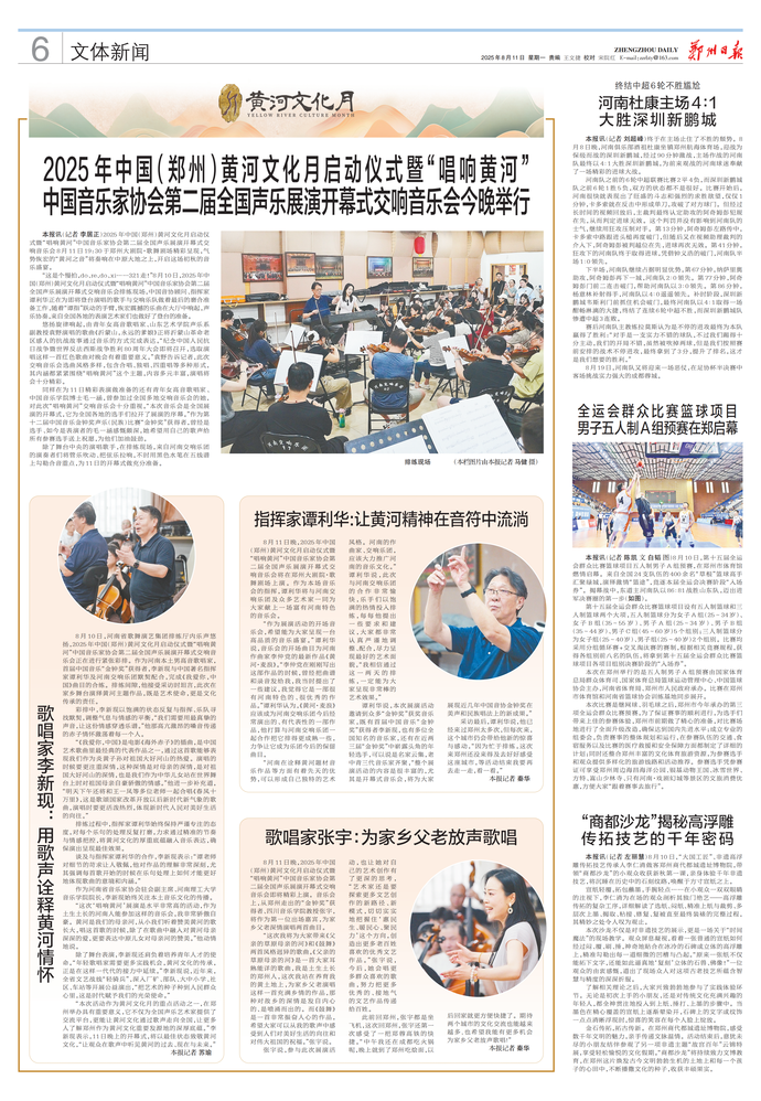 2025年中国(郑州)黄河文化月启动仪式暨“唱响黄河”中国音乐家协会第二届全国声乐展演开幕式交响音乐会8月11日19:30于郑州大剧院·歌舞剧场精彩呈现,气势恢宏的“黄河之音”将奏响在中原大地之上,开启这场初秋的音乐盛宴。(今日《郑州日报》6版)