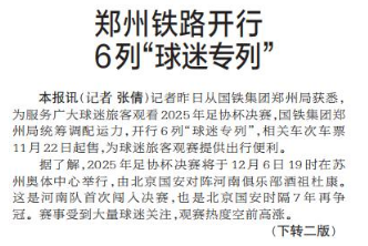 记者昨日从国铁集团郑州局获悉,为服务广大球迷旅客观看2025年足协杯决赛,国铁集团郑州局统筹调配运力,开行6列“球迷专列”,相关车次车票11月22日起售,为球迷旅客观赛提供出行便利。(今日《郑州日报》1版、2版)