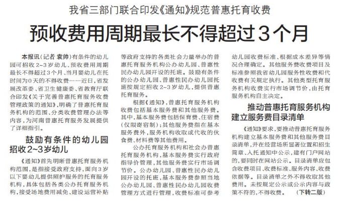 有条件的幼儿园可招收2~3岁幼儿、预收费用周期最长不得超过3个月、当月婴幼儿在托时间为0天的不得收费……近日,省发展改革委、省卫生健康委、省教育厅联合印发《关于完善普惠托育服务收费管理政策的通知》,明确了普惠托育服务机构的范围、分类收费管理办法等内容,为河南普惠托育服务发展提供了详细指引。(今日《郑州日报》1版、2版)