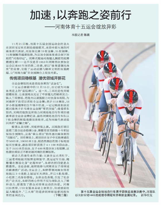 11月21日晚,当第十五届全国运动会的圣火在深圳宝安欢乐剧场缓缓熄灭,来自中原大地的河南体育代表团,用竞体比赛19枚金牌、15枚银牌、15枚铜牌的璀璨战绩,为这场全国体育盛会刻下深刻的“河南印记”。闭幕式现场河南健儿胸前的奖牌熠熠生辉——这不仅是自1959年河南首次参加全运会以来66年间的第二佳绩,更以“体育道德风尚奖”的荣誉,实现了运动成绩与精神文明的双重跨越,让“河南力量”在全国舞台上绽放光彩。(今日《郑州日报》1版、2版)