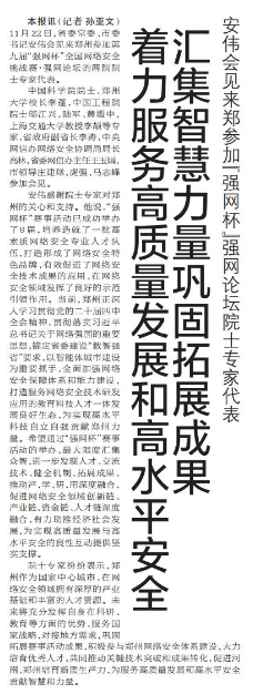 11月22日,省委常委、市委书记安伟会见来郑州参加第九届“强网杯”全国网络安全挑战赛·强网论坛的两院院士专家代表。(今日《郑州日报》1版)
