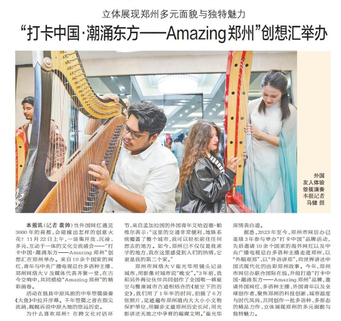 当外国网红遇见3600年的商都,会碰撞出怎样的创意火花?11月22日上午,一场集开放、沉浸、多元、互动于一体的文化交流盛会——“打卡中国·潮涌东方——Amazing郑州”创想汇在郑州举办。来自10余个国家的网红、青年与中央广播电视总台多语种主播、郑州网络大V及媒体代表齐聚一堂,在古今交响中,共同描绘“Amazing郑州”的精彩画卷。(今日《郑州日报》2版)