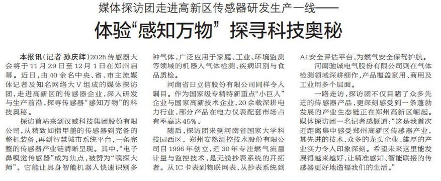 2025传感器大会将于11月29日至12月1日在郑州启幕。近日,由40余名中央、省、市主流媒体记者及知名网络大V组成的媒体探访团,走进高新区的传感器企业,深入研发与生产前沿,探寻传感器“感知万物”的科技奥秘。(今日《郑州日报》2版)