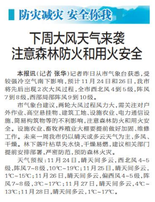 记者昨日从市气象台获悉,受较强冷空气南下影响,预计11月24日和26日,我市将先后出现2次大风过程,全市西北风4到5级,阵风7到8级,西部局部阵风9到10级。(今日《郑州日报》2版)