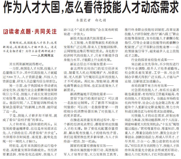 有新闻说,我国技能人才很多;也有新闻说,我国技能人才缺口很大。这是不是自相矛盾?为什么会有两种说法?——人民网网友 (今日《人民日报》1版)