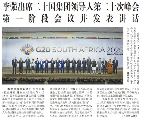 当地时间11月22日,国务院总理李强在约翰内斯堡出席二十国集团领导人第二十次峰会第一阶段会议,就“包容和可持续经济增长”议题发表讲话。二十国集团成员、嘉宾国领导人及有关国际组织负责人与会,南非总统拉马福萨主持会议。(今日《人民日报》1版、2版)