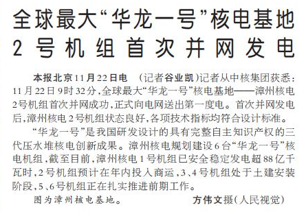 记者从中核集团获悉:11月22日9时32分,全球最大“华龙一号”核电基地——漳州核电2号机组首次并网成功,正式向电网送出第一度电。首次并网发电后,漳州核电2号机组状态良好,各项技术指标均符合设计标准。(今日《人民日报》1版)