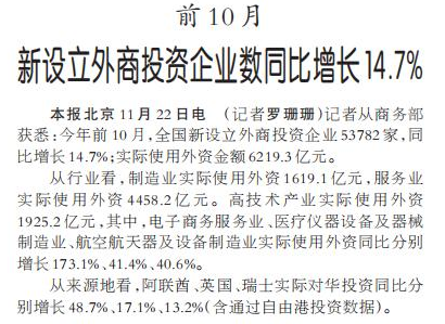 记者从商务部获悉:今年前10月,全国新设立外商投资企业53782家,同比增长14.7%;实际使用外资金额6219.3亿元。(今日《人民日报》1版)
