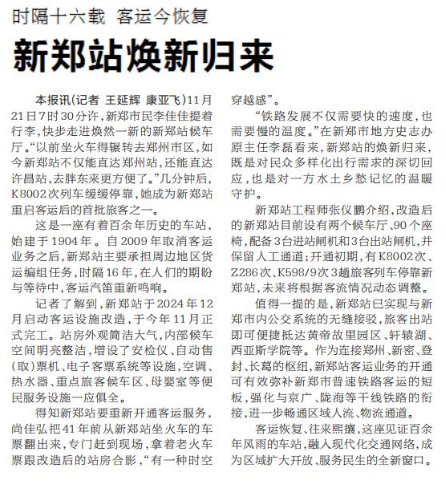 11月21日7时30分许,新郑市民李佳佳提着行李,快步走进焕然一新的新郑站候车厅。“以前坐火车得辗转去郑州市区,如今新郑站不仅能直达郑州站,还能直达许昌站,去胖东来更方便了。”几分钟后,K8002次列车缓缓停靠,她成为新郑站重启客运后的首批旅客之一。(今日《河南日报》1版)