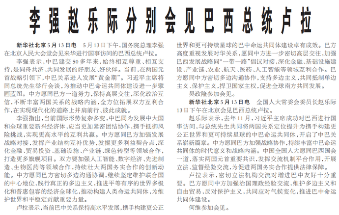 5月13日下午,国务院总理李强在北京人民大会堂会见来华进行国事访问的巴西总统卢拉。(今日《人民日报》3版)