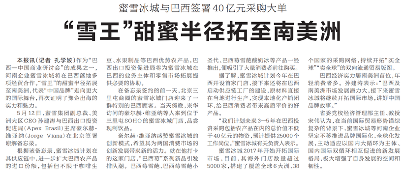 蜜雪冰城与巴西签署40亿元采购大单