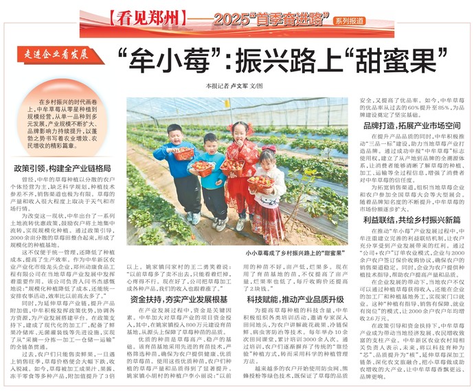 在乡村振兴的时代画卷上,中牟草莓从零星种植到规模经营,从单一品种到多元发展,产业规模不断扩大、品牌影响力持续提升,以蓬勃之势书写着农业增效、农民增收的精彩篇章。(今日《郑州日报》2版)