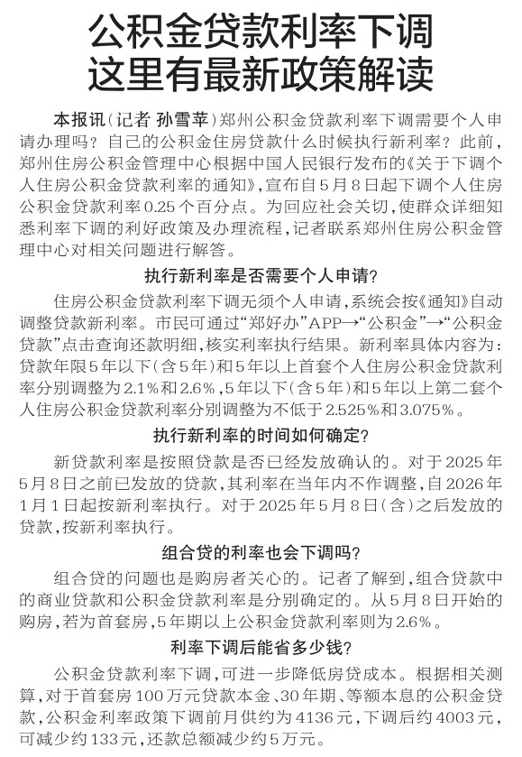 郑州公积金贷款利率下调需要个人申请办理吗?自己的公积金住房贷款什么时候执行新利率?此前,郑州住房公积金管理中心根据中国人民银行发布的《关于下调个人住房公积金贷款利率的通知》,宣布自5月8日起下调个人住房公积金贷款利率0.25个百分点。为回应社会关切,使群众详细知悉利率下调的利好政策及办理流程,记者联系郑州住房公积金管理中心对相关问题进行解答。(今日《郑州日报》2版)