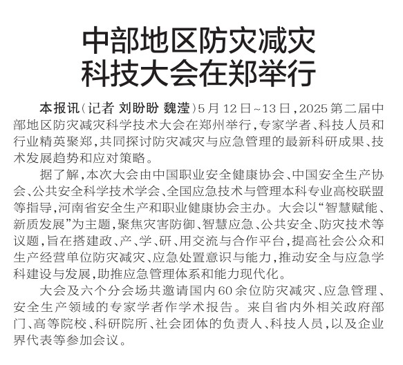 5月12日~13日,2025第二届中部地区防灾减灾科学技术大会在郑州举行,专家学者、科技人员和行业精英聚郑,共同探讨防灾减灾与应急管理的最新科研成果、技术发展趋势和应对策略。(今日《郑州日报》2版)