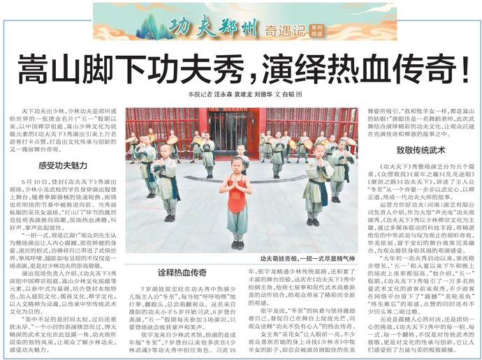 天下功夫出少林,少林功夫是郑州递给世界的一张烫金名片!“五一”假期以来,以中国禅宗祖庭、嵩山少林文化为底蕴元素的《功夫天下》秀演出引来上万名游客打卡点赞,打造出文化传承与创新的又一瑰丽舞台奇观。(今日《郑州日报》7版)
