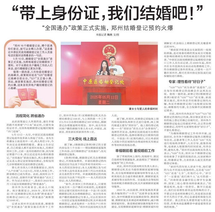 “全国通办”政策正式实施, 郑州结婚登记预约火爆