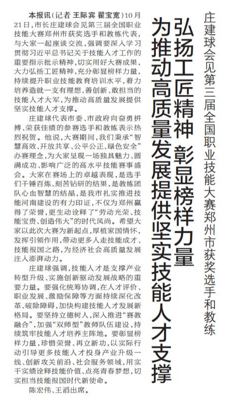 10月21日,市长庄建球会见第三届全国职业技能大赛郑州市获奖选手和教练代表,与大家一起座谈交流,强调要深入学习贯彻习近平总书记关于技能人才工作的重要指示批示精神,切实用好大赛成果,大力弘扬工匠精神,充分彰显榜样力量,持续提升职业技能教育培训水平,着力培养造就一支有理想、善创新、敢担当的技能人才大军,为推动高质量发展提供坚实技能人才支撑。(今日《郑州日报》1版)