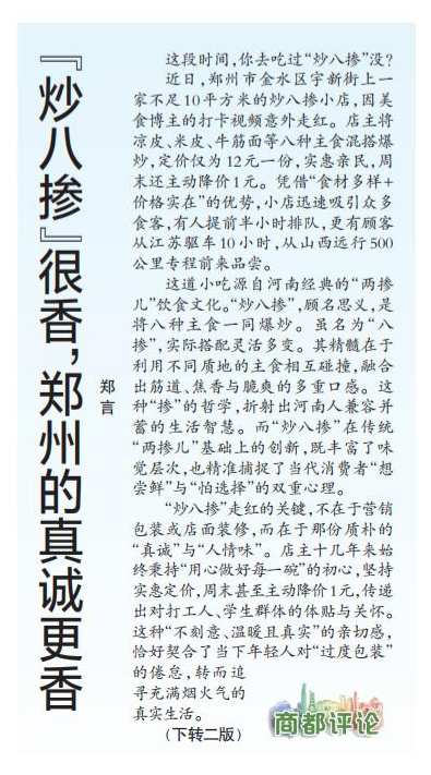 近日,郑州市金水区宇新街上一家不足10平方米的炒八掺小店,因美食博主的打卡视频意外走红。店主将凉皮、米皮、牛筋面等八种主食混搭爆炒,定价仅为12元一份,实惠亲民,周末还主动降价1元。凭借“食材多样+价格实在”的优势,小店迅速吸引众多食客,有人提前半小时排队,更有顾客从江苏驱车10小时,从山西远行500公里专程前来品尝。(今日《郑州日报》1版、2版)