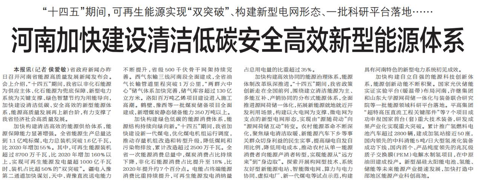 省政府新闻办昨日召开河南省能源高质量发展新闻发布会。会上介绍,“十四五”期间,我省以非化石能源为供应主体、化石能源为兜底保障、新型电力系统为关键支撑、绿色智慧节约为用能导向,加快建设清洁低碳、安全高效的新型能源体系,能源高质量发展再上新台阶,有力支撑了我省经济社会高质量发展。(今日《郑州日报》2版)