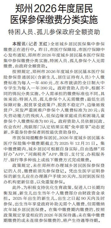 全省城乡居民医保集中参保缴费正在进行中。昨日,市医疗保障局、市医疗保障中心发布通知,郑州市2026年度城乡居民基本医疗保险集中参保缴费分类实施,特困人员、孤儿参保个人无需缴费,由政府全额资助。(今日《郑州日报》2版)