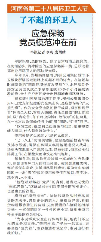 平时保障,急时应急。除了日常城市运维保洁,在防汛防灾、清冰除雪的应急保畅第一线,总跃动着郑州公用环卫人的那抹荧光绿。(今日《郑州日报》2版)