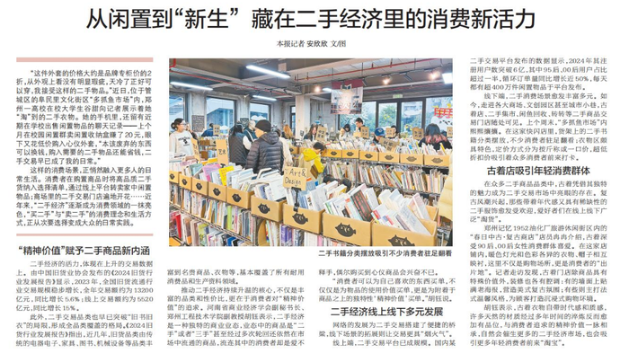 “这件外套的价格大约是品牌专柜价的2折,从外观上看没有明显瑕疵,天冷了正好可以穿,我接受这样的二手物品。”近日,位于管城区的阜民里文化街区“多抓鱼市场”内,郑州一高校在校大学生谷甜向记者展示着她“淘”到的二手衣物。她的手机里,还留有近期在学校出售闲置物品的聊天记录——上个月在校园闲置群卖闲置收纳盒赚了20元,眼下又花低价购入心仪外套,“本该废弃的东西可以换钱,购入需要的二手物品还能省钱,二手交易早已成了我的日常。”(今日《郑州日报》2版)