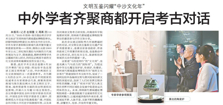 10月21日,“2025年郑州·埃尔奥拉考古学学术交流会”在郑州商代都城遗址博物院举办。时值中国和沙特建交35周年及中沙文化年,中外专家学者和相关领域代表齐聚华夏文明重要发祥地——郑州,围绕公元前2000年至公元二世纪埃尔奥拉与河南的古代城市规划与文字、贸易路线、精神世界等学术议题展开深入研讨,共同见证两国丰硕的文化交流成果和璀璨绽放的友谊之花。(今日《郑州日报》8版)