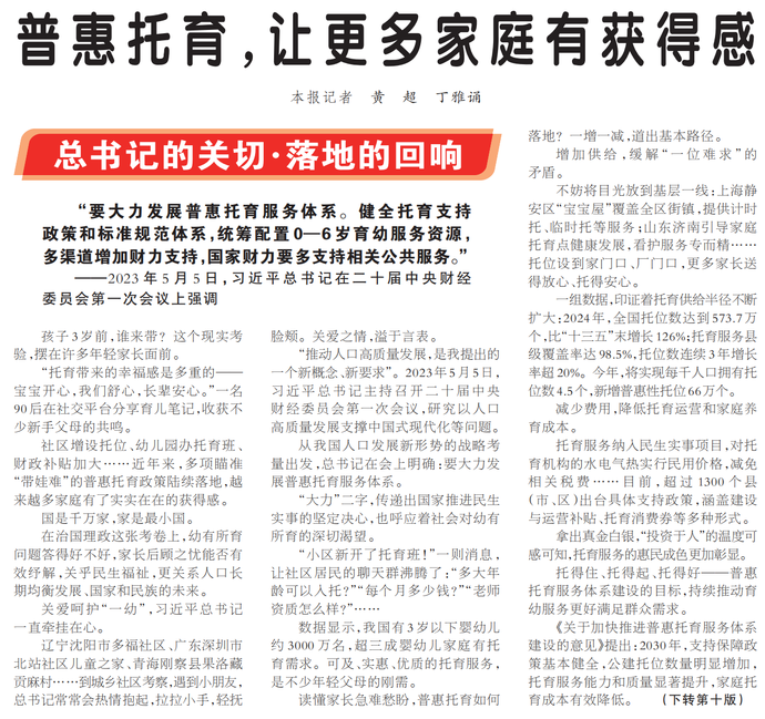 “托育带来的幸福感是多重的——宝宝开心,我们舒心,长辈安心。”一名90后在社交平台分享育儿笔记,收获不少新手父母的共鸣。(今日《人民日报》1版、10版)