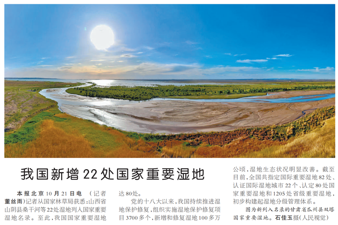 记者从国家林草局获悉:山西省山阴县桑干河等22处湿地列入国家重要湿地名录。至此,我国国家重要湿地达80处。(今日《人民日报》1版)