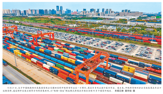 10月21日,位于中国铁路郑州局集团有限公司圃田站的中铁特货作业区一片繁忙,商品车专列正进行装车作业。连日来,中铁特货郑州分公司迎来商品车出口运输高峰,通过增开至连云港等方向的密集班列,以“铁路+海运”联运模式将商品车销往全球90多个国家和地区。(今日《河南日报》2版)