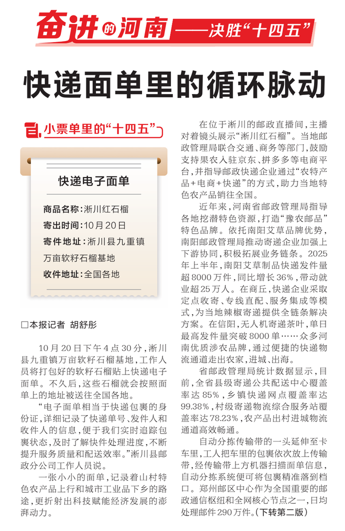 10月20日下午4点30分,淅川县九重镇万亩软籽石榴基地,工作人员将打包好的软籽石榴贴上快递电子面单。不久后,这些石榴就会按照面单上的地址被送往全国各地。(今日《河南日报》1版、2版)