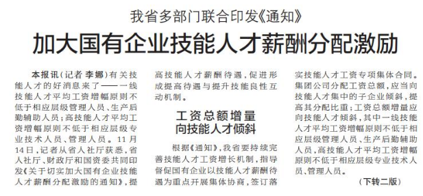 有关技能人才的好消息来了——一线技能人才平均工资增幅原则不低于相应层级管理人员、生产后勤辅助人员;高技能人才平均工资增幅原则不低于相应层级专业技术人员、管理人员。11月14日,记者从省人社厅获悉,省人社厅、财政厅和国资委共同印发《关于切实加大国有企业技能人才薪酬分配激励的通知》,提高技能人才薪酬待遇,促进形成提高待遇与提升技能良性互动机制。(今日《郑州日报》1版、2版)