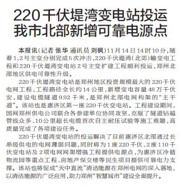 11月14日14时10分,随着1、2号主变分别完成5次冲击,220千伏堤湾(北郊)输变电工程和220千伏堤湾变电站2号主变扩建工程顺利投运,郑州北部地区供电可靠性升级。(今日《郑州日报》1版)